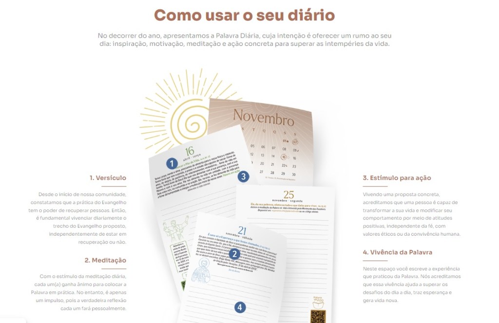 Este é o Diário da Fazenda da Esperança, produzido com o objetivo de aproximar você de Deus, com base na espiritualidade do Carisma da Esperança. Através dele, você pode experimentar um estilo de vida fundamentado na prática do amor ao próximo.